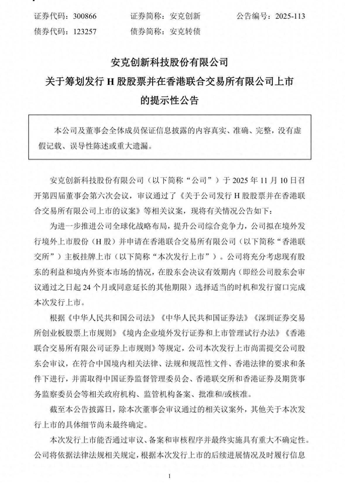 红网时刻新闻11月12日讯(记者 郭雅倩)11月11日晚,安克创新披露,为进一步推进公司全球化战略布局,提升公司综合竞争力,公司拟在境外发行境外上市股份(H 股)并申请在港交所主板挂牌上市。